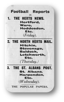 1 Western Division 2 Penalties missed by Hosier and Bennett The “Post” also reported on George Butcher’s debut for Hertfordshire’s match at Cambridge on 11th March 1909. “It was a pleasant surprise to see that the St Albans junior G.Butcher was given a trial in the team and he also, we hear, did very well. Butcher’s progress as a forward leaves one to expect great things of him for the future. To advance from the ranks of the City reserve team to a place in the County eleven in one season is no mean step. The only hope is that he will not be tempted to leave the City too soon.” |