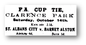 For the third year in succession, Barnet Alston were drawn to appear at Clarence Park in a qualifying round of the “English Cup” and in view of the semi-local rivalry and the keen contests the meetings between the teams in the past have engendered, a big muster of spectators was expected. Despite the dull weather, there was an attendance of quite 2,000 who, with, of course, the exception of the Alston’s not inconsiderable following, sustained a keen disappointment in the failure of the City to stand against a team who have never before beaten them on Clarence Park. The absence of S.Hatton from the City defence, as a result of which Wiggs played at right-back and Brightman appeared in the forward line, was the only change from the advertised elevens. Purvis won the toss for Barnet and decided to attack the York Road goal. The teams lines up, punctual to time.