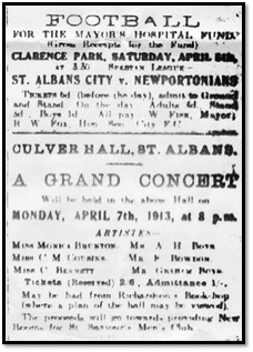It has been decided to devote the total proceeds of the “gate” on April 5th when the City meet the Newportonians (the most improved team in the League and one quite likely to lift the cup this year) to the St Albans and Mid Herts Hospital funds. The City Club will bear all expenses of the game and the Mayor (Councillor W.Fisk) will pay the ground charge, so that every penny taken at the gate and stand, or raised by the sale of tickets, will go to the Hospital.