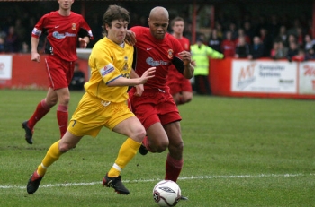 Conference strugglers yet FA Cup heroes Tamworth brought St Albans City’s barnstorming run of late to an abrupt halt at The Lamb on Saturday but the Saints exit from the FA Trophy was of scant concern to the Conference South leaders after defender Scott Cousins suffered a sickening broken ankle in the dying moments of an otherwise quickly forgotten 2nd Round tie. With added time almost complete Cousins, in outstanding form this season, flew full throttle into a tackle in front of the main stand with Tamworth’s Nathan Jackson but when he tried to stand saw his left foot hanging almost at a right angle. Even before referee Roger Vaughan could stop play individuals were swarming from all areas to assist the stricken defender. But City’s afternoon had gone badly wrong long before Cousins injury. Colin Lippiatt’s side gave no hint of their recent form and but for Paul Bastock could have been buried under an avalanche of goals in the closing stages. Without hitting any real highs St Albans appeared capable of defeating Mark Cooper’s side during the opening half hour but with little creativity in midfield and Eddie Anaclet doing a magnificent job in shutting out Matt Hann City laboured badly once behind to give one of their poorest displays of the season. From early on it was evident that City were struggling to impose their normal game against more physical and quicker opposition but after a scrappy opening, that set the tone for the afternoon, St Albans enjoyed their best spell. On eight minutes Hann picked up a loose ball and ran at the Lambs defence with his low cross-shot being smartly taken by Mark Gayle. But City’s best chance came on 15 minutes when Tom Davis and Mark Graham combined to find Cousins whose cross was poorly headed wide by the unmarked Lee Clarke. A City goal was seemingly edging ever closer and on 19 minutes Gayle again did well to save low by his near post as Hann, sent away by Davis, cut in from the right and shot crisply. Simon Martin had a volley blocked from a Hann corner while only an excellent tackle by Cousins denied Tamworth at a swift counter attack. But the writing was on the wall as City, somewhat surprisingly, looked low on self-belief and struggled to contain the towering Jackson although Ben Lewis was superb at the heart of the Saints defence. Twice Jackson forced Bastock to save before Tamworth scored the decisive goal on 39 minutes. Patrick Ada, not enjoying one of his better days, stumbled on the ball and was robbed by Jackson who teed up the free and debut making Daniel Davidson to almost scuff a shot past Bastock and into the visitors goal. City hopes dipped further a minute later when another good Cousins tackle won the ball and gave possession to Davis whose pass down the Saints left sent Martin away. After beating Gayle to the ball outside the penalty area Martin rolled his shot painstakingly goalwards only to see it rebound to safety of the foot of the back post. Thereafter City fell away disastrously and but for a string of wonderful saves by Bastock Tamworth would have run riot. Three times Bastock thwarted Jackson while Carl Heggs and Nick Wright forced outstanding saves from the brilliant Bostonian. City also had some unbelievable escapes as Davidson and Wright wasted two guilt edged chances before the game came to its sickening conclusion with Cousins completely innocent injury.