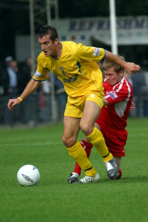 After an opening forty-five minutes of enthralling open attacking football at Clarence Park on Saturday St Albans City somewhat stumbled into Monday’s final qualifying round FA Cup draw thanks to the enduring brilliance of former Kettering Town goalkeeper Paul Bastock. Attacking down either flank to great effect during the first half the Saints fully justified their lofty league placing but for once the highest scoring forward line in the Conference South was firing blanks. Although City were unusually blunt in front of goal not all the blame lies at the feet of Simon Martin and Lee Clarke as the Poppies defended superbly, indeed such was the excellence of Kevin Wilson’s backline that visiting keeper Mark Osborn was not called upon to make a single save of note. Unchanged for the fifth successive match City soon got on top after an even and bright opening although Kettering were almost presented with an early gift as Bastock, uncharacteristically, needed two attempts to gather a James Gould free kick. But as City took the game to Kettering they were caught on the break with Ollie Burgess through ball sending Christian Moore clear, Bastock expertly delayed his dive until late and blocked the strikers shot with the rebound going onto Moore’s arm for a Saints free kick. Scott Cousins, maintaining his run of good form, exchanged passes with the lively Mark Graham then drilled a low ball across the goal with a defenders outstretched leg just diverting it away from the incoming Matt Hann at the last moment. Twice in a matter of minutes Graham squandered good chances with soft shots while Hann, positively exuding class down the City right, looked to have been impeded inside the penalty area by Craig McIlwain’s arm but for once referee Richard Kendall – who was a touch too fussy all afternoon – turned a blind eye. Still, though, the better openings were being created by the Conference North side and on 19 minutes Moore, from point blank range, should have forced home Gould’s knock down from close range but again Bastock was equal to the task. Midway through the half the exciting Hann won another corner that Scott Cousins sent deep to the back post where Brett Solkham sliced just over his own goal. Hann kept the pressure on the Kettering goal with an audacious drive towards the near post that Osborn did well to read and save. Having weathered City’s best spell of the game, which contained no shortage of high quality passing, Kettering hit back with a couple of half chances going begging before Moore, with an fine opportunist strike from 25 yards, forcing Bastock to go full stretch low to his right to concede a corner. Kettering looked to have scored following Burgess’s corner as McIlwain headed powerfully goalwards to Bastock’s right but again the 35-year old keeper saved acrobatically. City’s best opening was created on 37 minutes with Graham’s cross from the left falling to Clarke who exchanged passes with Martin before shooting narrowly wide from ten yards out. From City’s point of view the second half was a damp squib as their exuberant first half football faded and Kettering took control. On 56 minutes David Theobald’s glancing header from a Gould free kick seemed certain to open the scoring until being deflected over by his teammate Solkham. The Poppies were equally wasteful when McIlwain flicked on a Gould cross for the unmarked Andy Hall to fire just wide of Bastock’s left hand post. With City’s midfield fast being overrun Kettering continued to dominate and went close once more from a Gould free kick while Bastock, normally one of the strongest and most reliable kickers in the game, miscued some 30 yards out but was rescued as Gould, under pressure, sliced his shot as he sought to punish the City keeper. Four minutes from time City almost, and perhaps should have, landed the sucker punch as Bastock caught a Wayne Diuk free kick and with a powerful punt towards the York Road goal sent substitute Paul Hakim clear only for his shot to go tamely wide of Osborn’s goal.