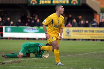 Two exquisite goals from the in-form Paul Hakim and a cruel own goal by Dons skipper Barry Moore helped St Albans City quell an industrious AFC Wimbledon on Saturday in front a partisan crowd of almost 2,000 at Kingsmeadow and move through to the 2nd Round of the FA Trophy. City headed to Surrey expecting a tough time against the side created by Dave Anderson, a former coach at St Albans under Bob Dowie. Wimbledon certainly did not disappoint although for all of the Dons enthusiasm and grit it was the Saints who provided the subtler and ultimately telling moments. Facing a piercing setting winters sun, City keeper Paul Bastock was called into action inside three minutes as he punched away Moore’s inswinging corner with Wes Daly’s follow up being deflected just over the goal. City responded with a good run and shot by Hakim that went wide while quick thinking by Moore with a short low free kick would have resulted in a goal had not Bastock reacted so instinctively in moving swiftly to block Richard Butler’s flick as the City defence stood motionless. Although Wimbledon were enjoying the greater share of the play City appeared more than capable of unpicking an unconvincing Dons defence as proven by a rasping Dean Cracknell drive that Andy Little required two attempts to smother as Lee Clarke closed in. On 25 minutes the Ryman League Premier Division side, playing in a game rated as the biggest in their short existence, went ahead with a simple goal. Butler held off Aaron Barnett to a long ball and turned the City defender with ease before slipping a low soft right-footed shot to the right of Bastock desperate dive. Two minutes later Barnett almost stumbled the ball over the line but was denied by Little but on 28 minutes the keeper, stranded in no mans land, could only look on as Hakim’s perfect lob from Tom Davis’s excellent ball over the home defence bounced into the goal sited in front of the packed home terrace. Wimbledon hit back with a penetrating run by Butler that was thwarted by the most outstanding player on the park, Nick Burton, whose well-timed challenge ended the danger. With chances being created at either end Scott Cousins traded passes with Mark Graham before seeing his low shot blocked by the sprawling Little. The Dons wasted a golden opportunity when Dave Sargent’s long ball sent Michael Harvey clear but his square pass was completely fluffed by the free Shane Smeltz. City went ahead for the first time on 38 minutes with the highest quality move of the entire chilly afternoon. Davis played the ball up to Clarke who ran forward from his own half and slid a glorious pass into the path of Matt Hann, his ball into the box stylishly tucked away by Hakim for his seventh goal in nine games. St Albans’ lead survived just eight second half minutes before referee Alison Chapman – whose performance was far better than the constant baying of the home support suggested – declared that Barnett handled whilst on the ground and pointed to the penalty spot. An audible sigh of disbelief could be heard as former Saint Sargent stepped up to take the kick but he almost raised the roof with a fine left-footed effort inside Bastock’s right hand post. For the next tree minutes the Dons laid siege to the City goal with Smeltz twice going close as City defended in numbers but the final twist came at the opposite end of the pitch in the 58th minute. Harvey went in heavily on Clarke but only succeeded knocking the ball down the right for Chris Seeby to retrieve by the goalline and drill low towards the near post where Hakim’s clever dummy led to the ball bouncing off Antony Howard onto the retreating Moore and into Dons net. City had an amazing let off when Clarke clambered all over Harvey without conceding a blatant. Saints continued to threaten on the break and during more than seven minutes of added time were content to hold the ball by the corner flag only to lose possession and be caught on the break themselves and during a frantic finale were thankful to see another Dons attack flounder as Butler’s header came back off the crossbar.