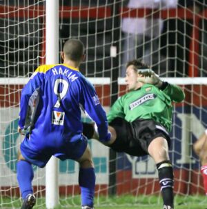 Paul Hakim, who toiled away manfully with little reward for an hour, caused one-time City keeper Tony Roberts to fumble when collecting a through ball but it was of little surprise when, in the third minute of added time, Dagenham struck for the third time. Sloma crossed from the right to Dave Rainford, one of at least five former Bishop's Stortford players on the pitch, who brought the ball down and unleashed a marvellous shot across Bastock that came to rest inside the keepers left hand post.