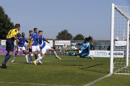 City were soon back on the attack with Ashmore coming to Gosport’s rescue with another excellent save low to his right following Comley’s powerful downward header from Chappell’s corner.