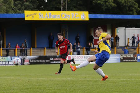 Darren Locke was next to blaze off target, following a header by Theophanous, but it was from an unlikely source, skipper Adam Everitt, that United almost regained the lead when the veteran of 92-games for St Albans flashed a fine shot narrowly wide from distance.