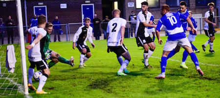 With the wind to their backs for the opening 45 minutes City posed the early threat with Theophanous, following a cross from the right by Billy Gibson, shooting across Luke Purnell’s goal from a tight angle and just wide of the far post.