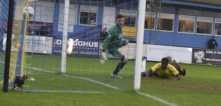 Edwards guided a superb low pass across the six yard box that bisected ‘keeper Tim Brown, and defender Mark Haines, only for Krans to be denied a certain goal when the ball hit a divot and bounced between his legs, as he shaped for a simple tap in.